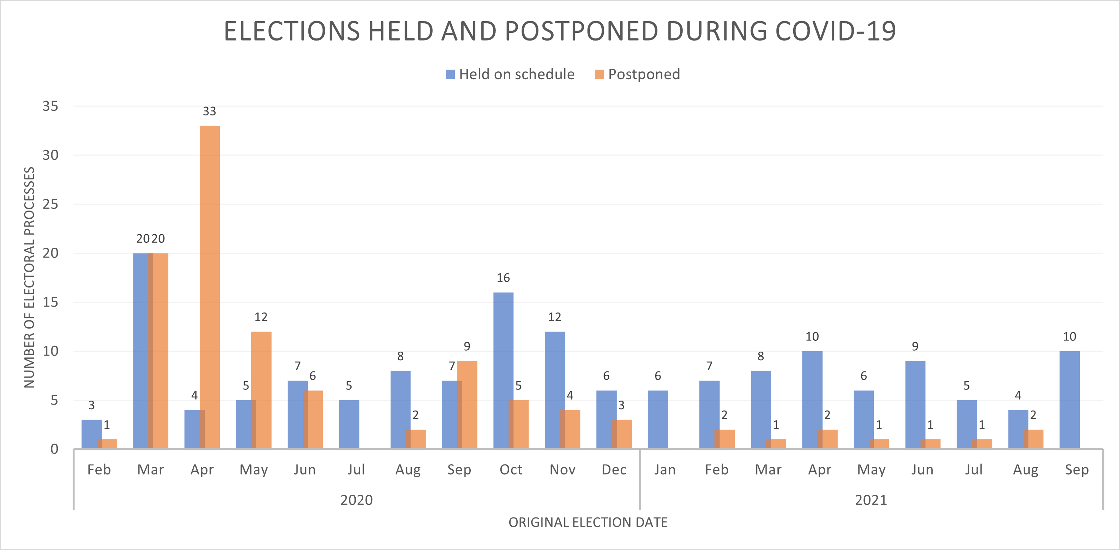 - at least, 65 countries and territories have held elections that were initially postponed due to concerns related to Covid-19 of which at least 33 have held national elections or referendums.